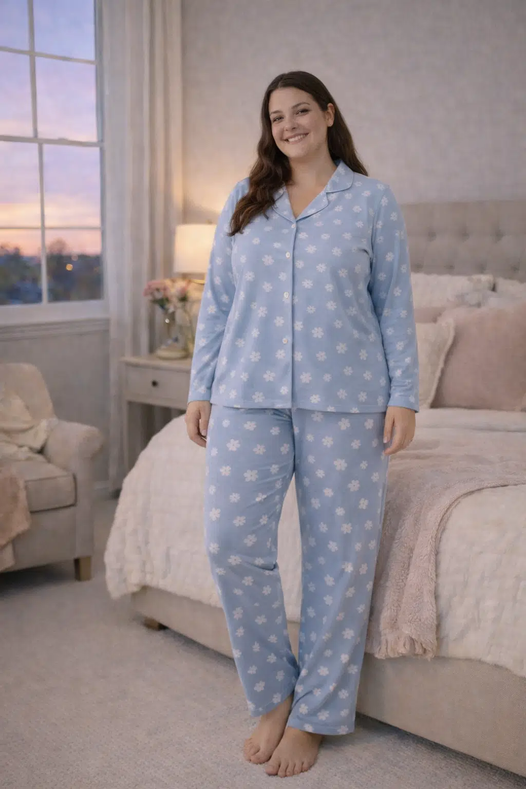 Büyük Beden Uzun Kollu Kadın Pijama Takımı – Yumuşak Dokulu Esnek Kumaş Düğmeli Rahat Kalıp