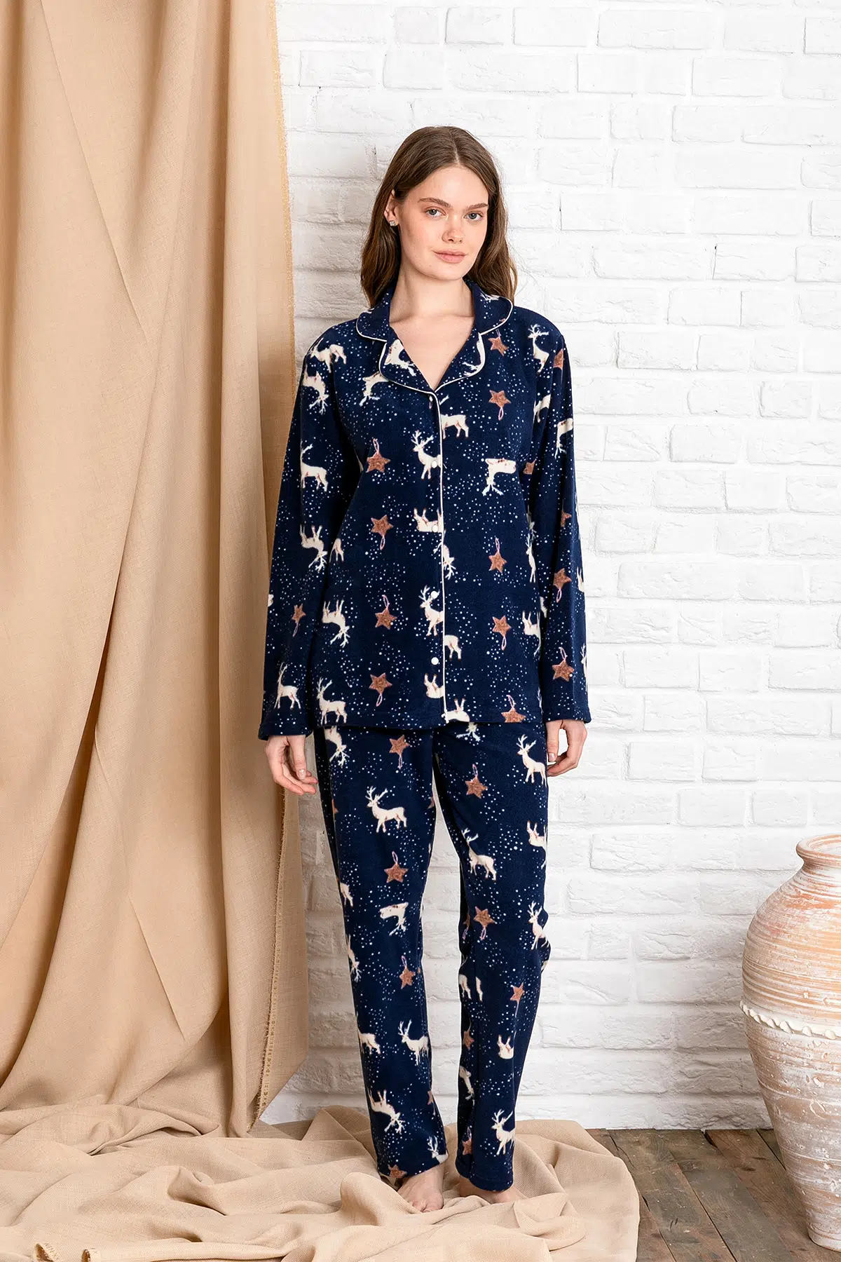 Kadın Uzun Kollu Kışlık Peluş Polar Önden Düğmeli Pijama Takımı