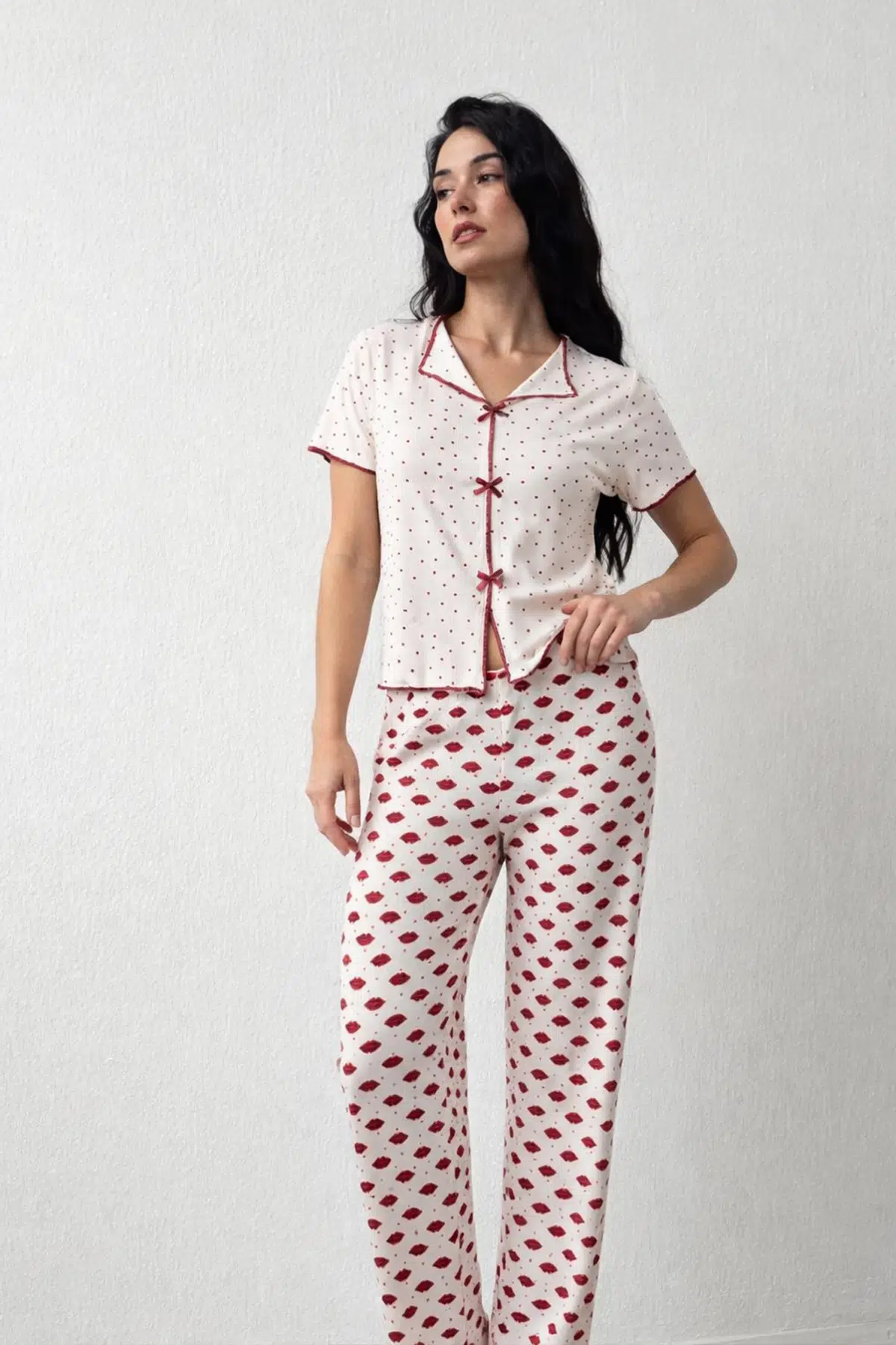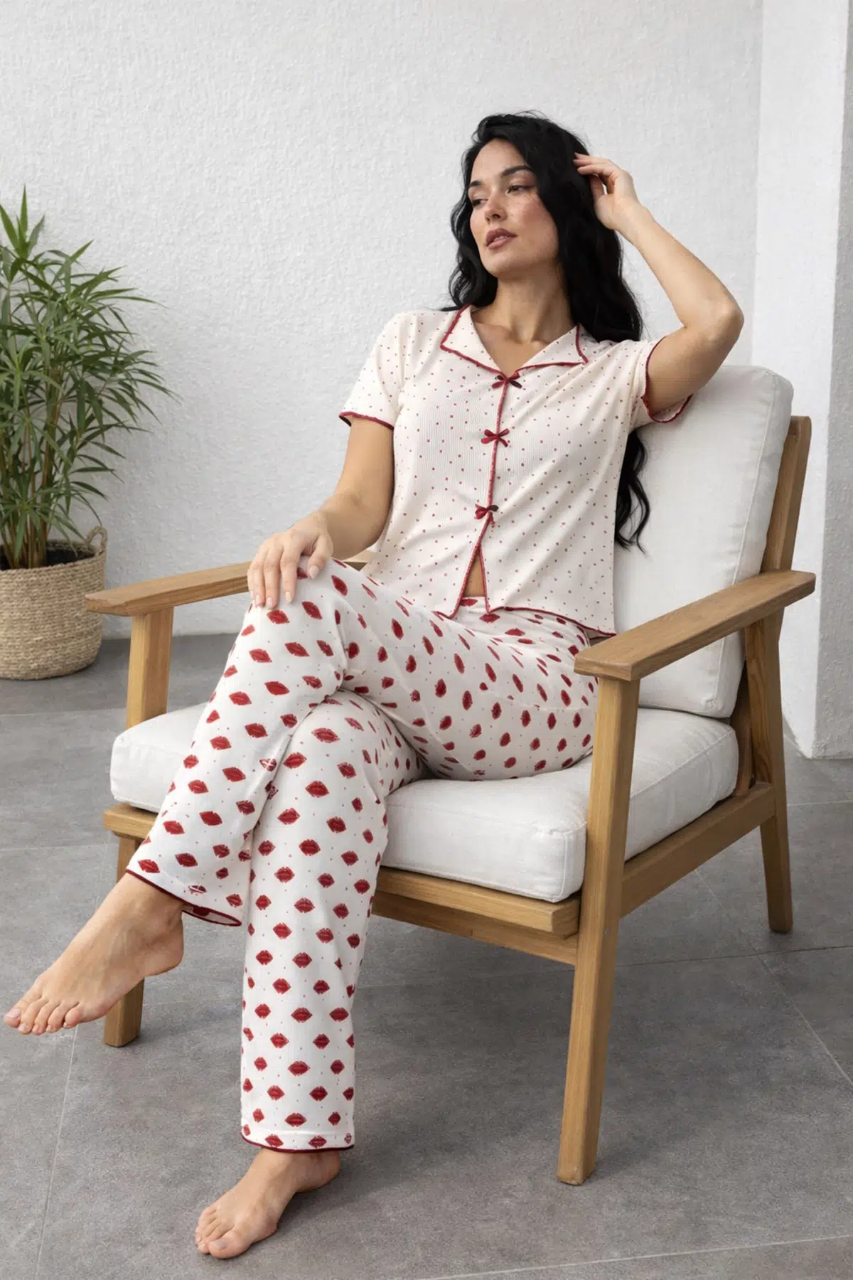 Özenle seçilen zarif desenleri ve fiyonk detayları, bu modeli sıradan bir pijamadan ayırarak zamansız ve premium bir ev giyim parçasına dönüştürür. S–5XL beden aralığında üretilen kalıbı, farklı vücut tiplerine uyum sağlayarak herkes için aynı şıklık ve rahatlığı sunar.