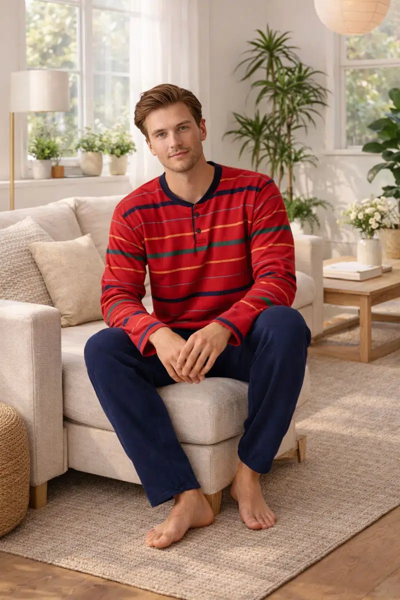 Erkek polar pijama takımı, uzun kollu bir üst giyim ve uyumlu alt pantolondan oluşur. Üst, klasik bir tasarıma sahip olup düğme detayları ile donatılmıştır, bu da giyip çıkarmayı son derece kolay hale getirirken şıklık katmaktadır. Alt, rahat bir uyum için elastik bir bel bandıyla tasarlanmıştır.