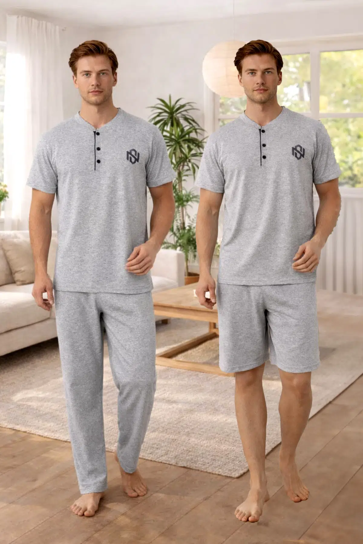 Mevsimlik 3 Parça Erkek Kısa Kollu Pamuk Penye Pijama Takımı, rahat ve şık bir uyku deneyimi için idealdir. Yüksek kaliteli pamuk penye kumaşı, yumuşak dokusu ve nefes alabilir yapısıyla gece boyunca konfor sağlar. Kısa kollu üst parçası, serin ve rahat bir uyku ortamı sunarken, esnek bel bandına sahip şort ve pantolon seçenekleri her bedene uyum sağlar. Üç parçadan oluşan bu takım, mevsim geçişlerinde de ideal kullanım sunar.